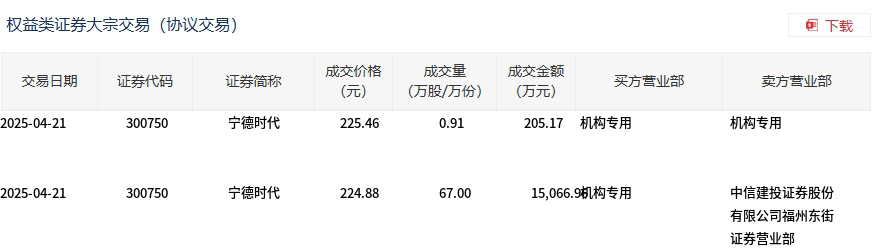4月21日,宁德时代大宗交易成交67.91万股,成交额1.53亿元,占当日总成交额的2.91%,成交均价224.89元,较市场收盘价231.36元折价2.8%,其中最高成交价225.46元,最低成交价224.88元。
