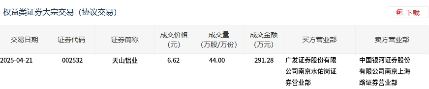 4月21日,天山铝业大宗交易成交44万股,成交额291.28万元,占当日总成交额的0.58%,成交价6.62元,较市场收盘价7.58元折价12.66%。