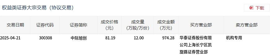 中际旭创今日大宗交易平价成交12万股,成交额974.28万元