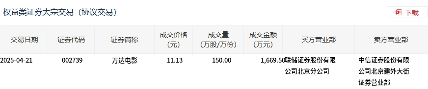 4月21日,万达电影大宗交易成交150万股,成交额1669.5万元,占当日总成交额的5.59%,成交价11.13元,较市场收盘价11.36元折价2.02%。