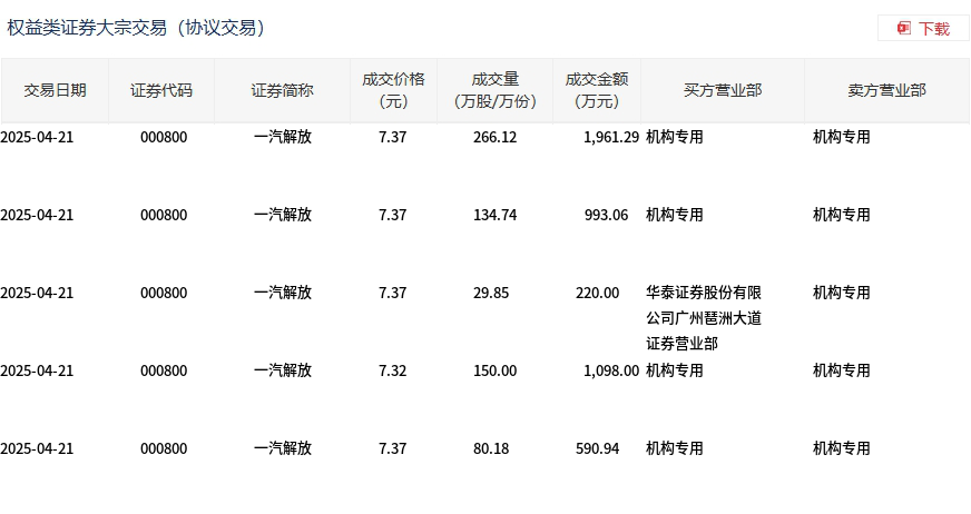 4月21日,一汽解放大宗交易成交660.89万股,成交额4863.29万元,占当日总成交额的26.46%,成交均价7.36元,较市场收盘价7.37元折价0.15%,其中最高成交价7.37元,最低成交价7.32元。