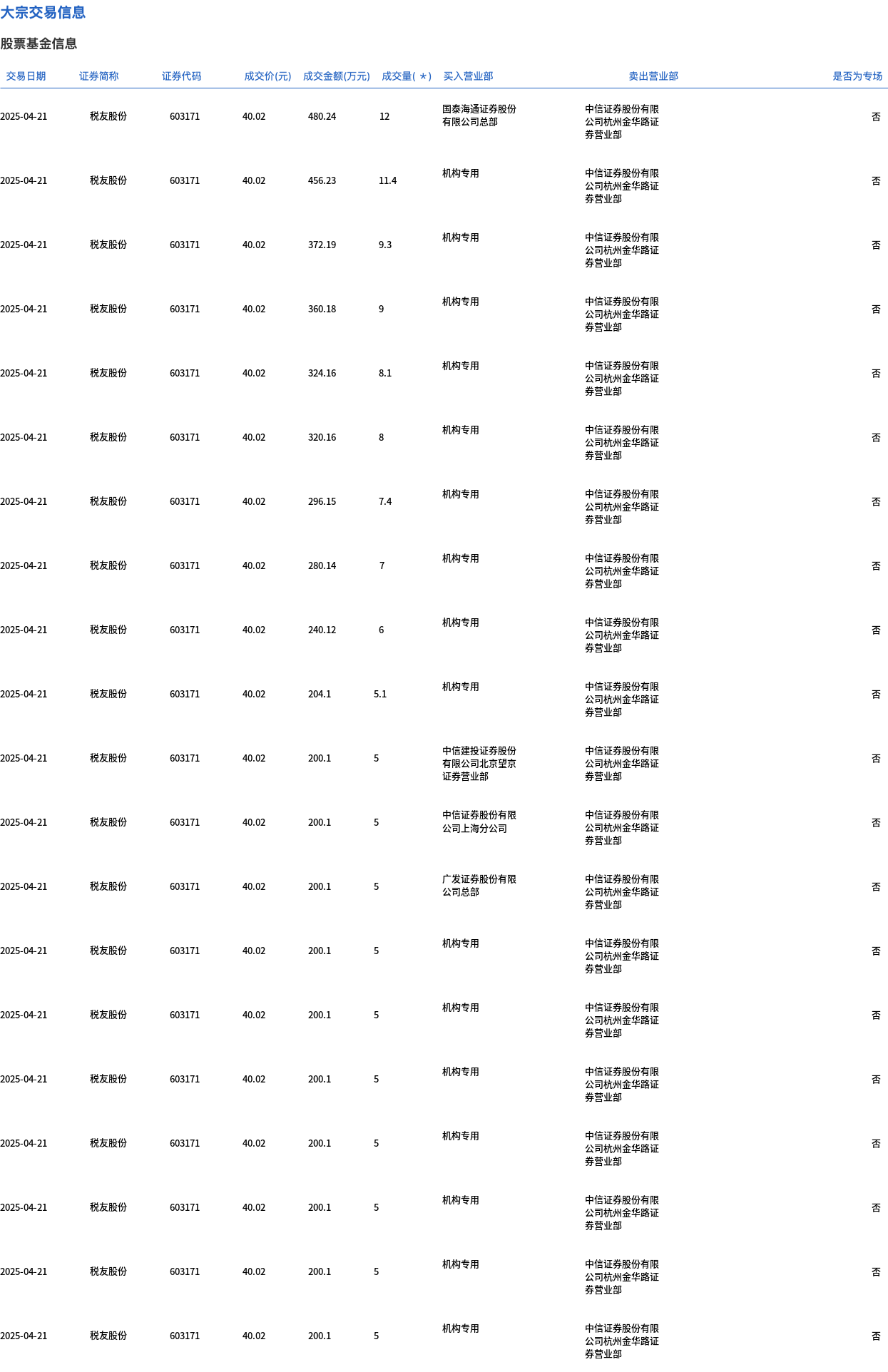 4月21日,税友股份大宗交易成交334.26万股,成交额1.34亿元,占当日总成交额的31.66%,成交价40.02元,较市场收盘价45.48元折价12.01%。