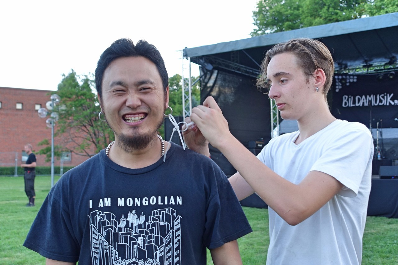 演出结束的第二天,我和图利古尔以及他们的经纪人蛾子(本名十分好听,不过她坚持要我这样称呼她)约在了北新桥地铁站附近的“等待戈多”咖啡馆见面。刚子脱下了蒙古袍,左右耳各戴一个大铁环,穿着黑T,乍一看像个有点凶的东北大哥,宗璨还是长发飘飘的滚青范儿,穿一件棕色毛衣很文静的样子,二人看似南辕北辙,但聊起天来却十分合拍,可以说十分爆笑了。