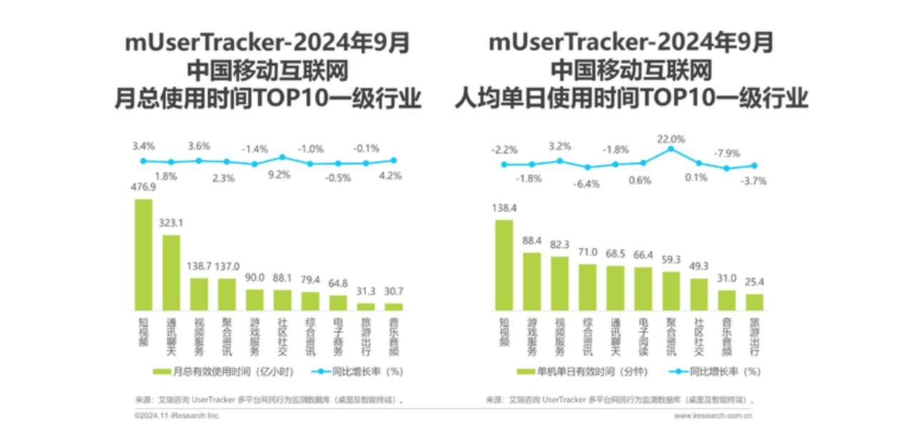 参考艾瑞咨询发布的《2024年Q3中国移动互联网流量季度报告》,从月总使用时间来看,虽然短视频、通讯聊天仍是瓜分网民移动端使用时间的前两大行业,可是短视频和通讯聊天之间的差距非常明显;在用户单日使用时间上,短视频的人均单日使用时间为138.4分钟,而通讯聊天仅为68.5分钟,前者足足是后者的两倍。