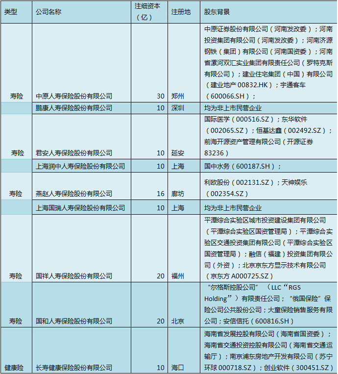 注册资本偏高的拟设险企,往往得到了当地国资、上市公司以及外资的共同支持。以注册资本最高的中原人寿为例,其发起股东既有隶属于河南发改委的中原证券股份有限公司和河南投资集团有限公司,隶属于河南国资委的河南济源钢铁(集团)有限公司;亦有宇通客车(600066.SH)以及建业地产(00832.HK)的建业住宅集团(中国)有限公司。此外,中原人寿的股东中还出现了外资罗特克斯有限公司全资子公司河南省漯河双汇实业集团有限责任公司。