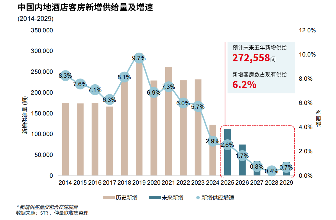 随着地产行业的增速放缓,国内酒店市场的投资从过去的大规模新建,转向存量改造。根据仲量联行发布的《中国内地酒店市场2024年回顾与2025年展望》显示,中国内地酒店客房新增供给量及增速在2019年达到峰值后,近年来,呈现明显的放缓趋势。根据仲量联行的趋势预判,存量时代下,酒店投资主题围绕资产重塑。