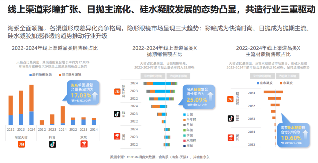 具体而言,淘系在不同品类的隐形眼镜中持续领跑,单渠道复合增长率约为17.03%。其中,彩瞳成为消费热点,日抛逐渐主导抛期选择,硅水凝胶材质产品销售额占比不断提升,彰显发展潜力,在隐形眼镜行业趋势演变中发挥着重要引领作用。