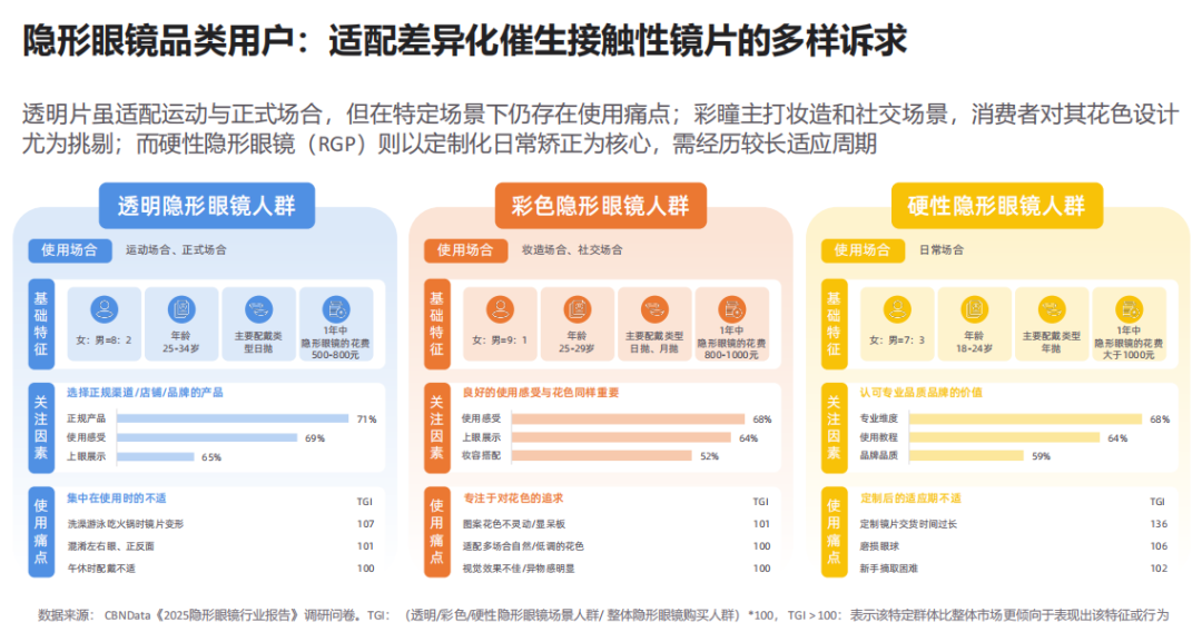 具体到消费者对不同品类的需求,透明片适配运动与正式场合,配戴时常出现不适感成为品类痛点。彩瞳主打妆造与社交场景,消费人群追求花色的时尚感。硬性隐形眼镜以定制化的日常矫正为核心,定制后有较漫长的适应周期。