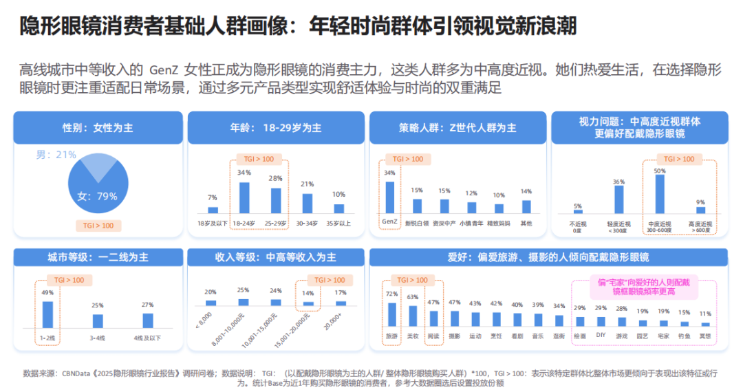 《报告》显示,高线城市中等收入的GEN Z女性正成为隐形眼镜的消费主力,且多为中高度近视,并且热爱户外运动。对他们而言,隐形眼镜能够减少在进行户外活动时的干扰,多元的产品类型也能够实现舒适体验和时尚的双重满足。