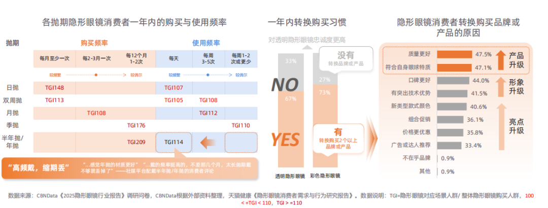 《报告》进一步指出,隐形眼镜购买频率与其使用频率有强相关性,日抛型用户维持每月至少一次的复购节奏,是隐形眼镜的高频消费群体;季抛/半年抛产品则因购买频次与使用活跃度同步走低。但年抛用户群体形成了“高频使用,缩期更换”的行为模式,有超6成的白片使用者以及超7成的彩瞳使用者会在一年内更换产品与品牌。