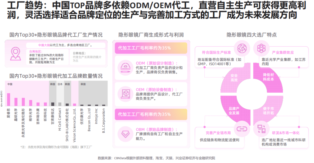 产业上游,多数品牌依赖OEM/ODM 代工,但《报告》显示直营自主生产利润更高,灵活选择适配工厂成为未来方向。一方面,工厂优势关乎品牌竞争力,天猫在渠道侧设置严选标准,筛选品牌工厂证照、产能与专利。品牌还通过国际多地建厂实现能源联产,如库博光学的波多黎各工厂启用了新的发电设施,可将碳排放量减少33%,相当于减少5,000辆汽车上路。彩瞳赛道,头部品牌如moody早在五年前便开始投资建厂,凭自研技术、15项专利/软著壁垒构建竞争优势。