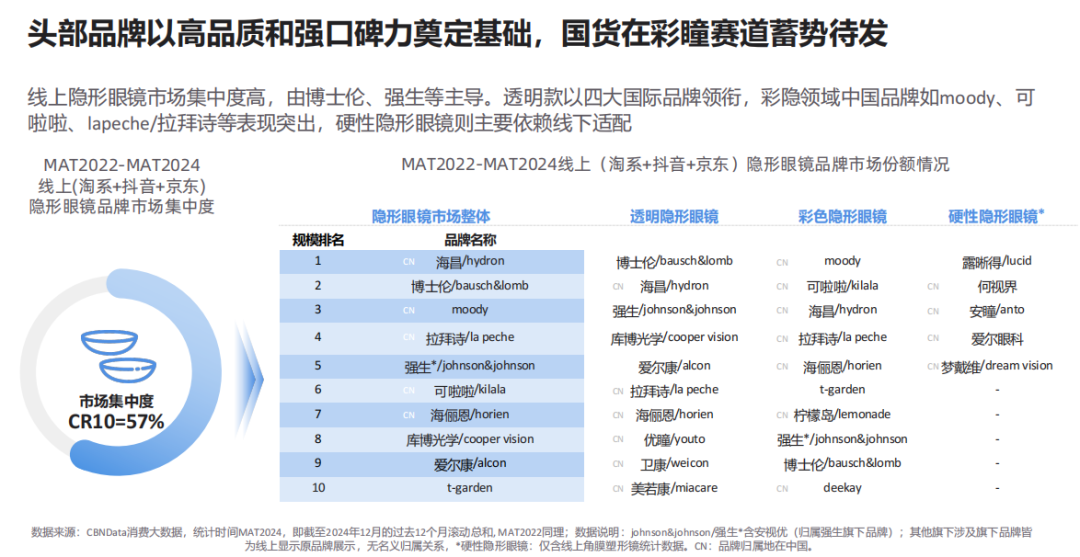 从品牌格局来看,当前线上隐形眼镜市场高度集中,国际品牌如博士伦、强生以品质口碑构筑壁垒,而moody、可啦啦等国内头部品牌则通过精准捕捉Z世代审美偏好,在彩色镜片赛道中脱颖而出。
