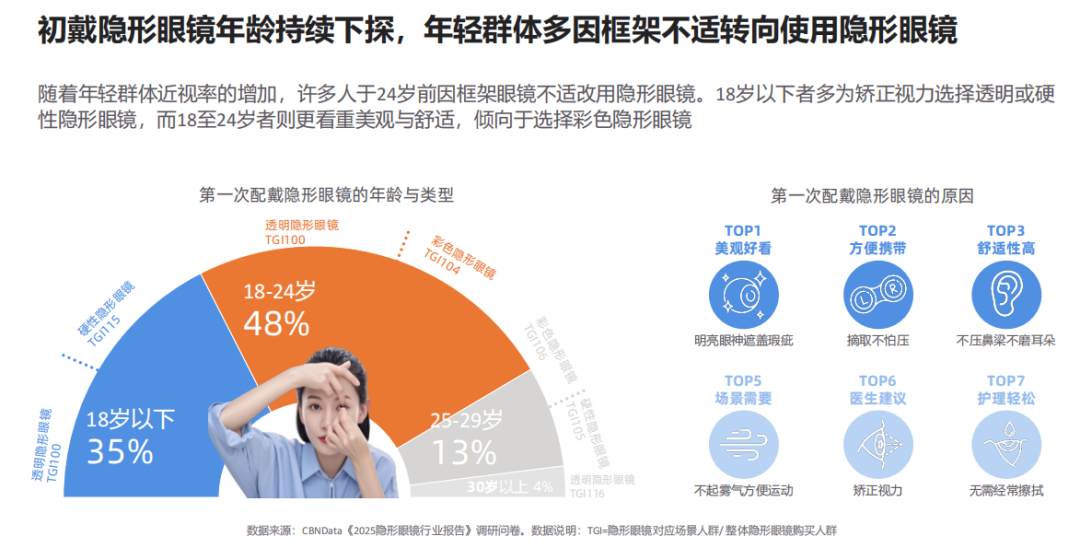 值得一提的是,初次配戴隐形眼镜的人群年龄持续下探,数据显示,超八成人群在24岁之前已尝试配戴隐形眼镜。18岁以下人群以矫正视力为主要目的,18至24岁的人群则出于美观、方便与舒适的需求,初次选择配戴彩色隐形眼镜。