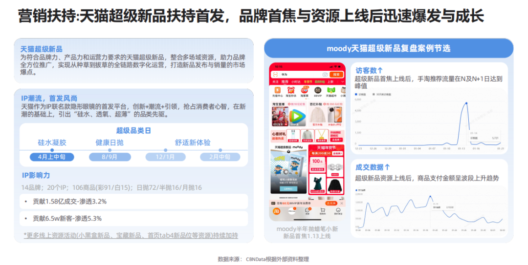 在营销侧,《报告》也提出,“健康日抛X硅水凝胶科技X新鲜的时尚设计X全天候适配”是品牌所能锚定的营销趋势,围绕着产品、价格渠道与促销品牌能够打开更多推广玩法。在更前沿方向上,通过光学智能品牌能够拓展娱乐、医疗以及科技领域的新裸眼体验。另外,通过渠道侧联合发力引爆流量也能够为品牌带来全链路的收益。天猫超级新品通过整合多场域资源,为品牌带来全链路数字化运营。moody在超级新品首页焦点上线后手机淘宝推荐流量达到峰值,商品支付金额也呈现上升趋势。