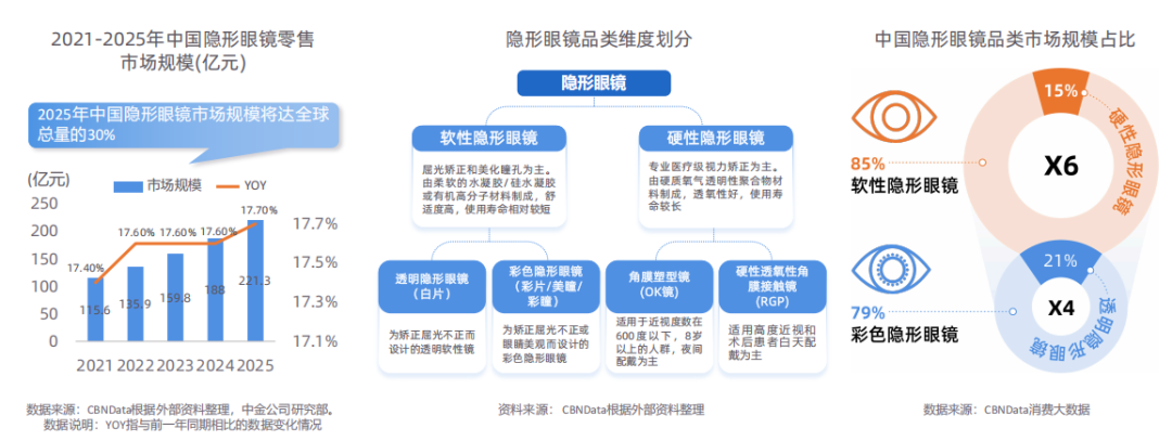 具体而言,中国隐形眼镜市场在五年内快速增长,2025年预估市场规模将突破200亿元。品类端,硬性产品专注专业视力矫正领域,与消费级定位的软性隐形眼镜形成功能互补,后者以85%的市场份额主导市场,规模达硬性产品的6倍,构成行业基本盘。软性隐形眼镜基于功能有进一步的品类分化:透明片专注基础屈光矫正,彩色镜片则通过花纹设计与色彩创新拓展美容装饰价值。数据显示,彩色镜片市场规模已达透明片的近4倍。