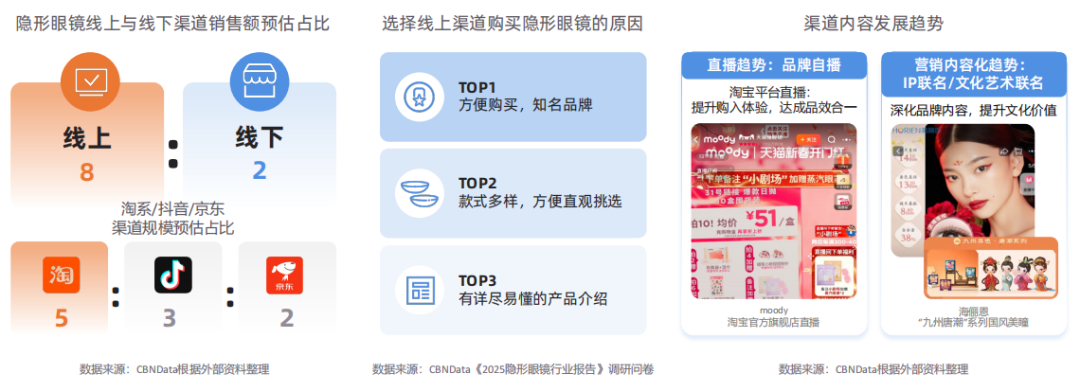 下游渠道变革最为显著。线上平台占据约八成的市场规模,成为隐形眼镜销售主阵地。其中淘宝天猫、抖音与京东形成分化格局,淘宝占据五成市场份额,成为隐形眼镜行业线上销售的核心渠道。随着电商渠道的扩容,直播电商与内容营销逐渐演变为品牌角逐的新增长极。
