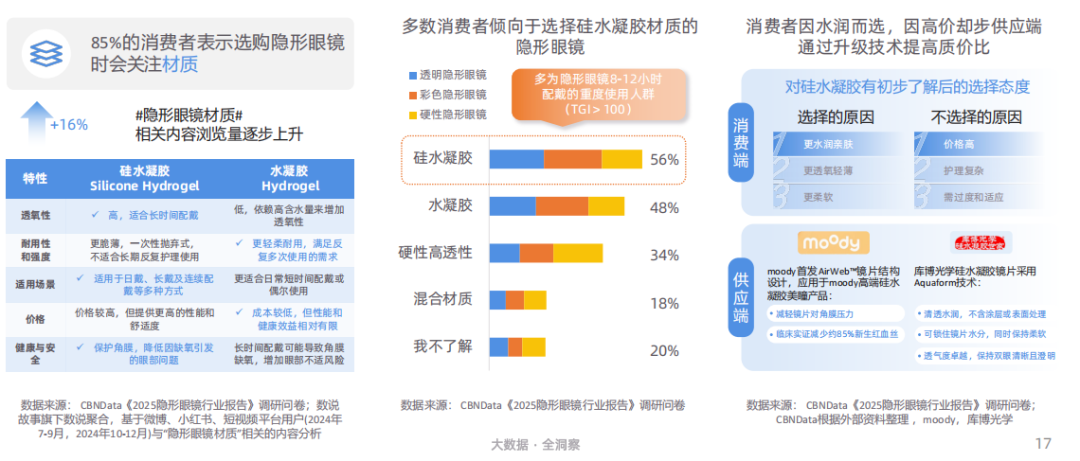 此外,消费者开始日益重视隐形眼镜的材料。《报告》调研结果及数说故事旗下数说聚合数据显示,多数消费者倾向于选择硅水凝胶材质的隐形眼镜,这一材质具备高透氧性与耐用性,但也有消费者因价格高放弃购买,这也意味着供应端通过原料技术研发提升质价比更为重要。捕捉到消费者需求,彩瞳冠军品牌moody表示,其首发的AirWeb 硅水凝胶镜片结构设计,能减轻镜片对角膜的压力,从而减少戴镜引起的新生红血丝;白片领域的库博光学也提出,其硅水凝胶镜片采用Aquaform技术,可以实现在镜片材料中不添加表面保湿涂层或润湿剂的前提下,让镜片从核心到表面都保有充足水分。