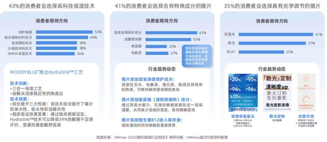 硬性隐形眼镜则持续深耕“精准医疗级”,在提升配戴舒适度以及强护理体验上发力,提升适配相容性、功能性以及简化护理环节是消费者的三大期待。