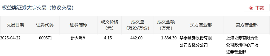 4月22日,新大洲A大宗交易成交442万股,成交额1834.3万元,占当日总成交额的23.07%,成交价4.15元,较市场收盘价4.15元持平。