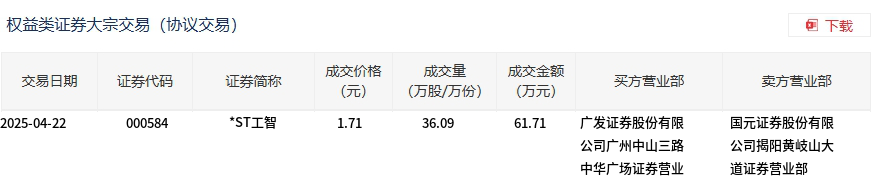 4月22日,*ST工智大宗交易成交36.09万股,成交额61.71万元,占当日总成交额的20.15%,成交价1.71元,较市场收盘价1.71元持平。