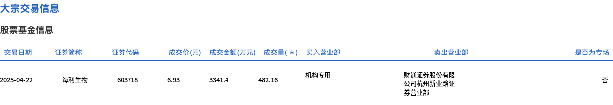4月22日,海利生物大宗交易成交482.16万股,成交额3341.4万元,占当日总成交额的23.65%,成交价6.93元,较市场收盘价7.11元折价2.53%。