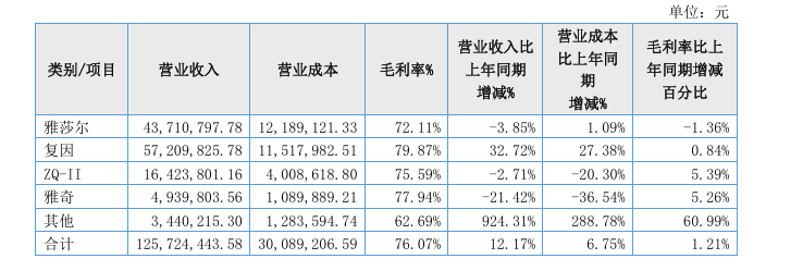 从营收构成来看,雅莎股份主要收入来源于旗下的四个护肤品牌:雅莎尔、复因、ZQ-II、雅奇。其中,雅莎尔和复因两大核心品牌贡献了绝大部分的营收来源。
