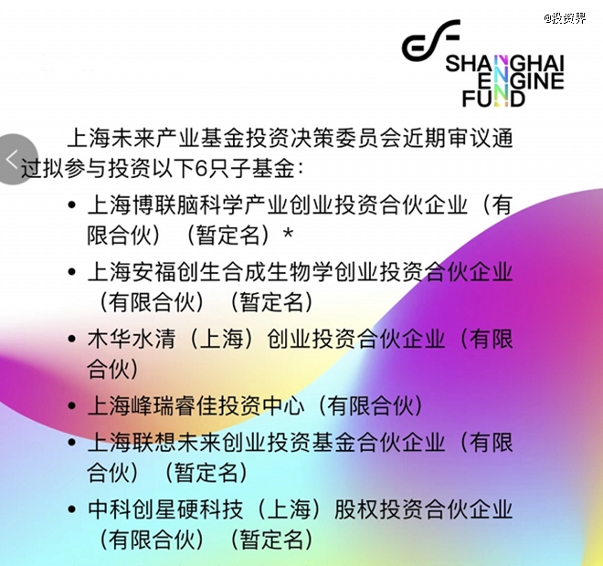 紧锣密鼓之中,入选GP正式出炉。根据上海未来产业基金公示,这6只子基金分别是上海博联脑科学产业创投、上海安福创生合成生物学创投、木华水清(上海)创投、上海峰瑞睿佳投资中心、上海联想未来创业投资基金、中科创星硬科技(上海)股权投资基金,为一级市场注入宝贵的募资活水。