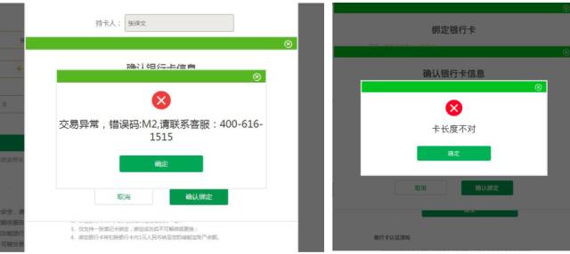 野马财经小编也尝试在绿能宝官网进行了注册、绑卡、充值的过程,然而当进行到绑卡环节时,就显示“交易异常”、“卡长度不对”等原因无法在进行下去,而经小编反复核实,持卡人和银行卡信息并没有错误,详见下图: