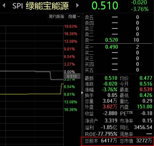 野马财经(微信公号:ymcj8686)通过东方财富网choice终端发现,绿能宝在4月19日收盘价为0.51美元/股,相比于其上市首日收盘价16美元/股,已经下跌近97%,市值仅剩3272万美元,约合人民币2.25亿元,详见下图: