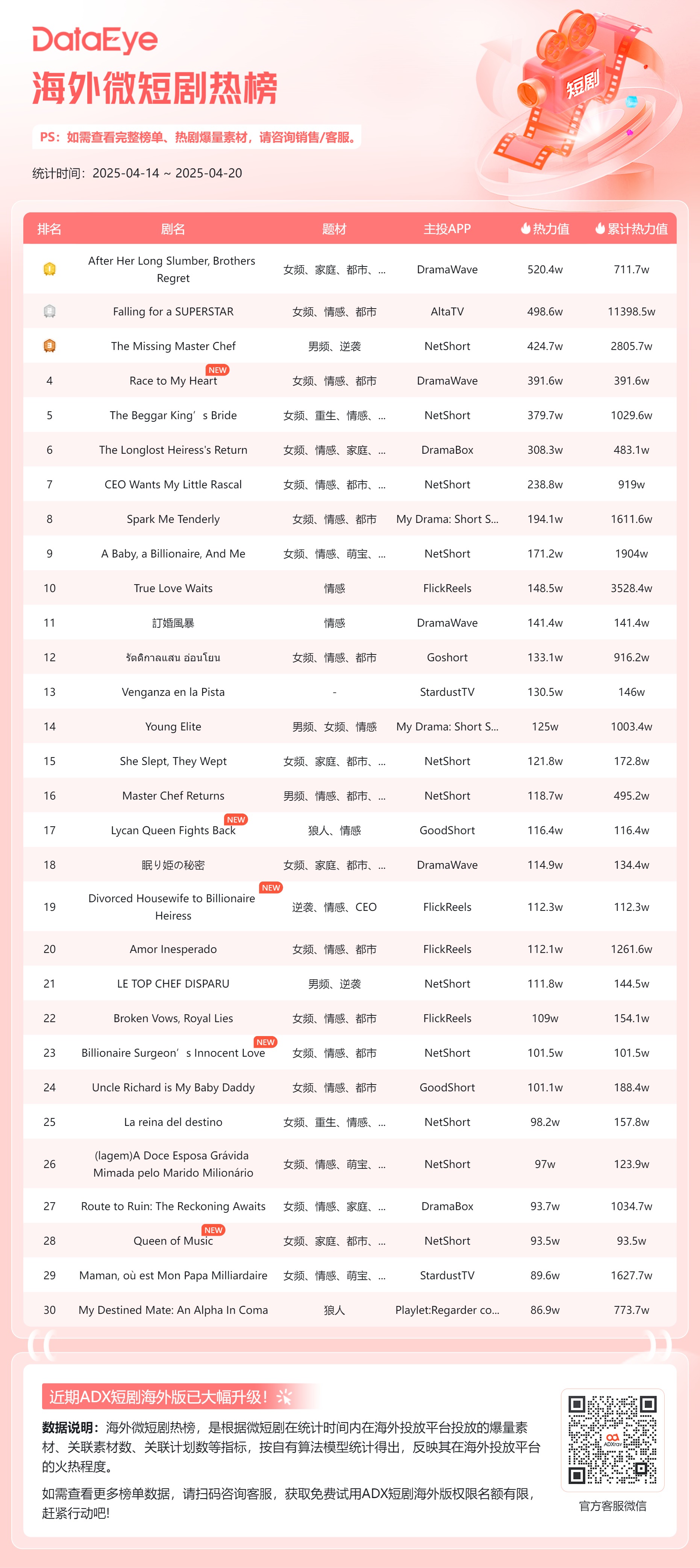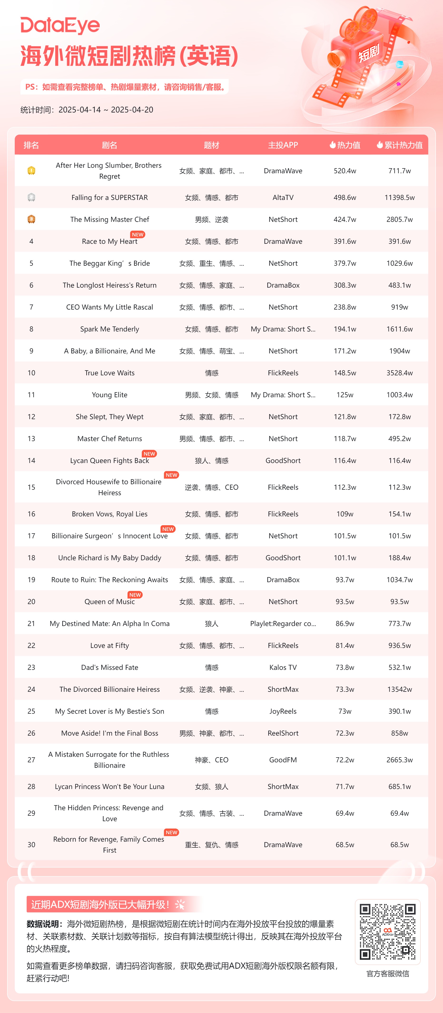本期(4月14日-4月20日)DataEye海外英文短剧热榜,《After Her Long Slumber, Brothers Regret》登顶;《Falling for a SUPERSTAR》第二;《The Missing Master Chef》位列第三。共有6部新剧上榜。