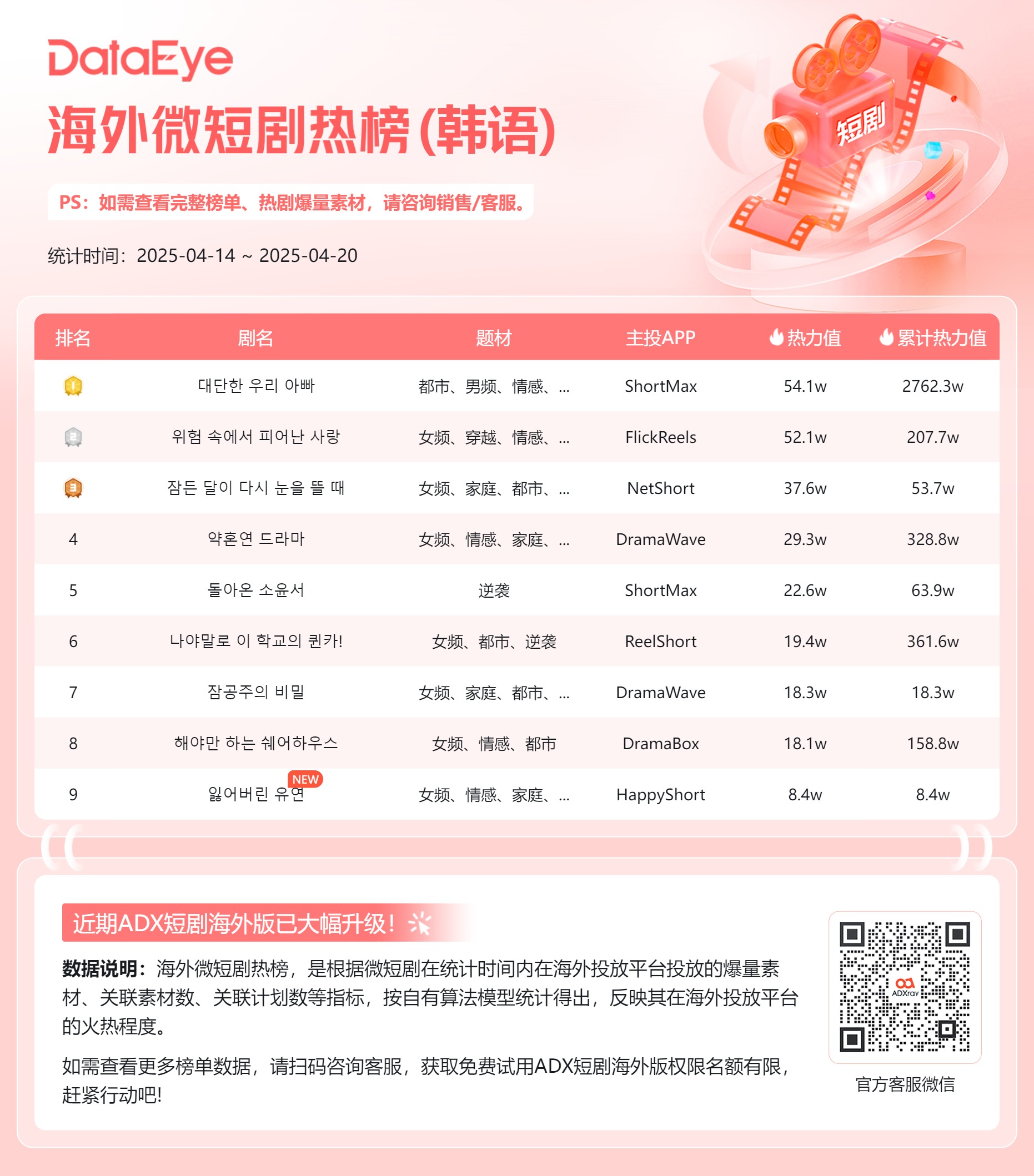 本期(4月14日-4月20日)DataEye海外韩文短剧热榜,短剧《대단한 우리 아빠》第一;《위험 속에서 피어난 사랑》第二;《잠든 달이 다시 눈을 뜰 때》位列第三。本期共有1部新剧上榜。