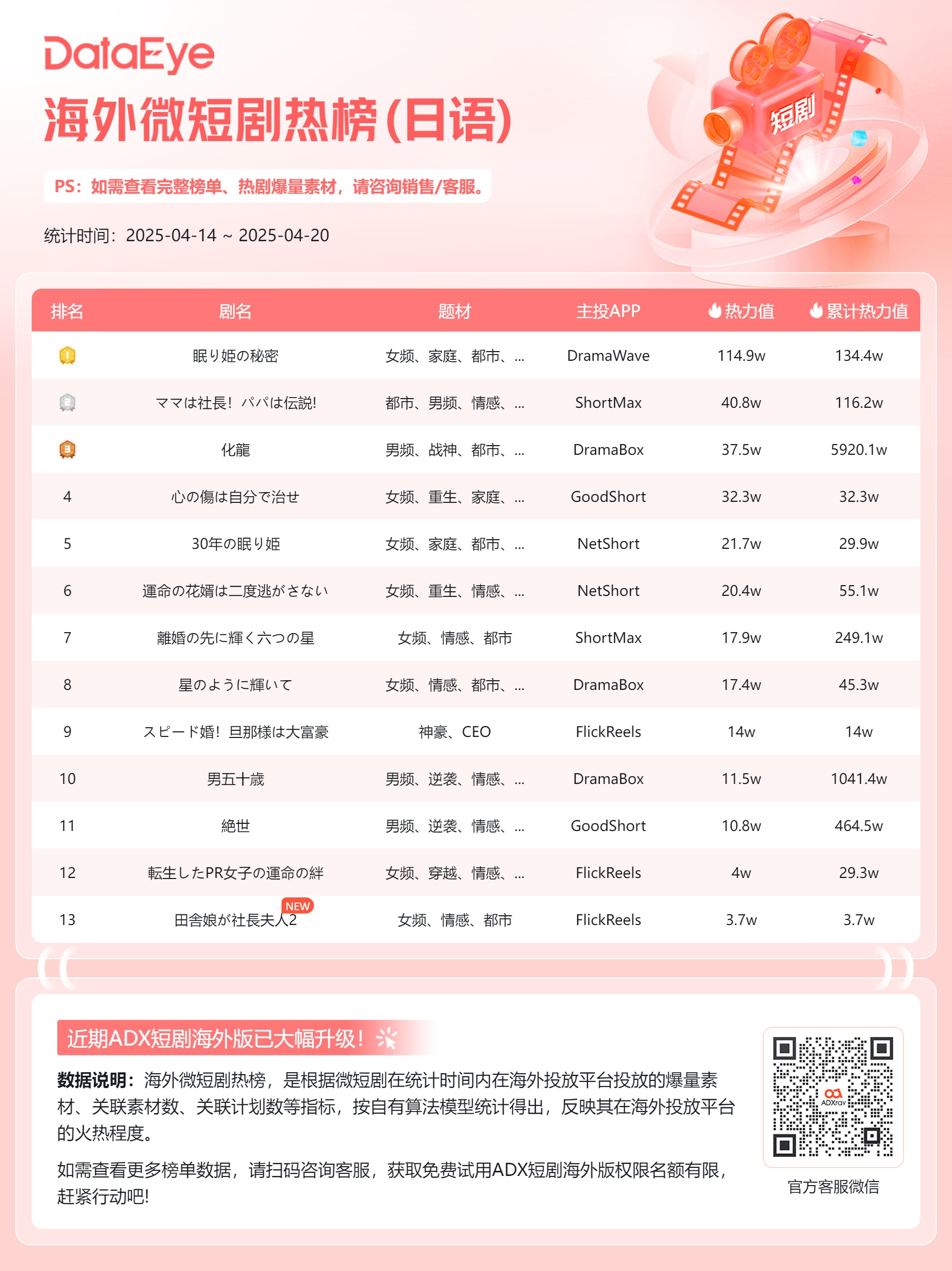 本期(4月14日-4月20日)DataEye海外日文短剧热榜,《眠り姫の秘密》登顶;《ママは社長!パパは伝説!》第二;《化龍》再次闯入TOP3。