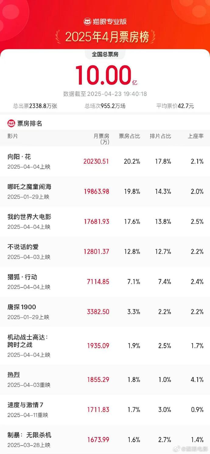 据猫眼专业版数据,4月22日19时40分,2025年4月总票房破10亿,《向阳·花》领跑4月票房榜。
