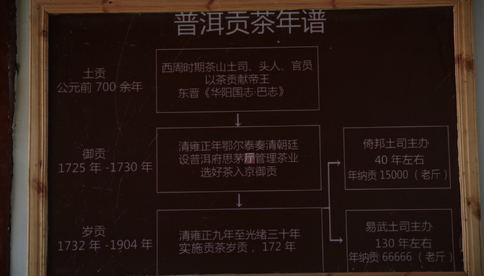 博物馆里除了雕塑和石碑,还有一张六角形的石桌非常精致,刀先生介绍说这个石桌是当时专为古六大茶山的头人坐在一起分摊贡茶任务、商讨茶山管理事宜而制作 的。1732年起,清朝廷要求每年进贡,指定倚邦土司主办年纳贡15000斤,易武土司主办年纳贡66666斤。易武和倚邦过去的茶农民间流传着“采办贡 茶,忙上不忙下”,采办贡茶成为当地的头等大事。