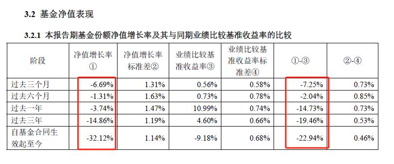 截至一季度末,该基金过去六个月、过去一年、过去三年、成立以来的回报均明显跑输业绩基准。