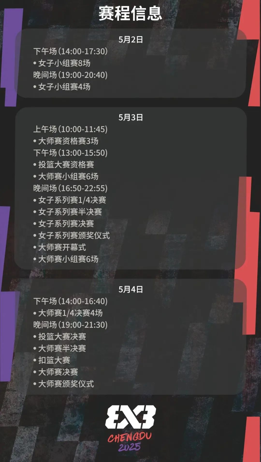 参与方式:第一步,点击关注“运动成都”微信公众号;第二步,后台回复关键词“5月2日三人篮球”或“5月3日三人篮球”,获取对应场次的抽奖链接。抽取5月2日下午场10张,5月3日上午场10张,每个账号限领一张。另外,微博也有送票活动。关注@运动成都参与微博送票活动,将抽取5月3日晚上场A等票5张,4日晚上场A等票5张,每个账号限领一张,抽奖时间截至4月22日18时。参与抽奖后请关注后台私信,在4月22日18时前未回复运动君私信者视为放弃中奖名额,该名额将另行抽取。