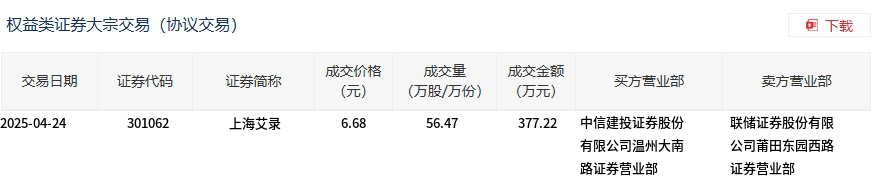 4月24日,上海艾录大宗交易成交56.47万股,成交额377.22万元,占当日总成交额的5.6%,成交价6.68元,较市场收盘价8.02元折价16.71%。