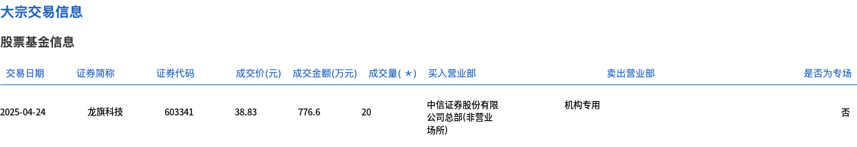 4月24日,龙旗科技大宗交易成交20万股,成交额776.6万元,占当日总成交额的6.83%,成交价38.83元,较市场收盘价39.18元折价0.89%。