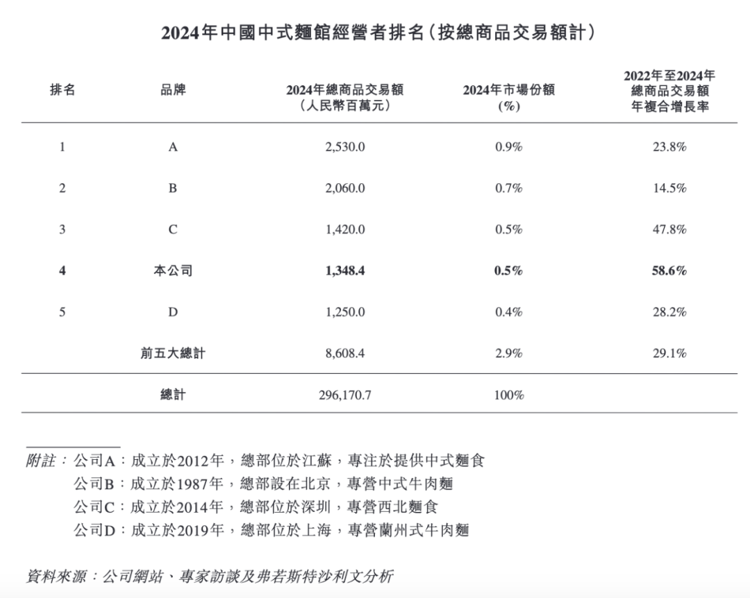遇见小面招股书显示,在中国中式面馆排名中,公司A成立于2012年,总部位于江苏,专注于提供中式面食,所指的应该就是和府捞面,其市场份额为0.9%,2024年总商品交易额为25.3亿元。