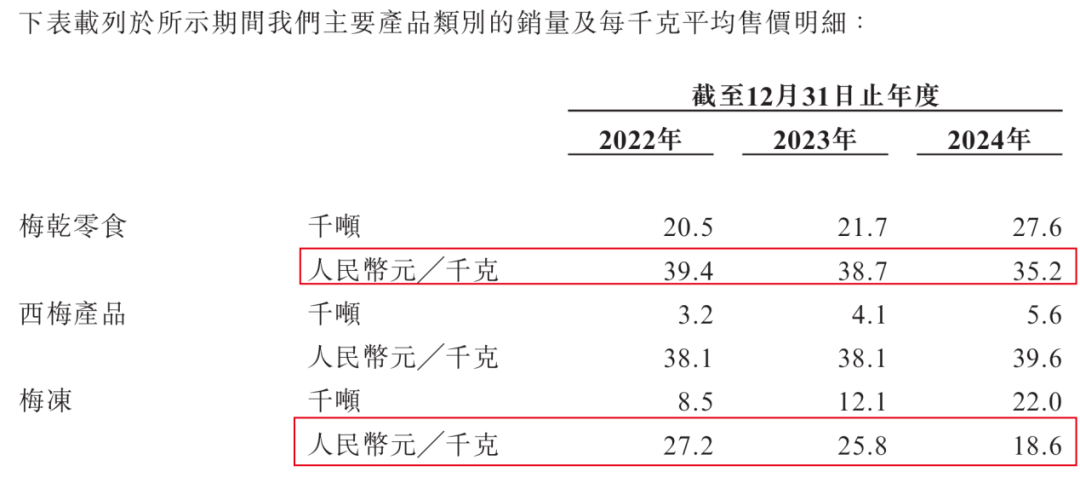 招股书显示,公司两大核心产品梅干零食和梅冻售价连续走低。报告期内,梅干零食每千克平均售价分别为39.4元、38.7元、35.2元,逐年下降;梅冻的每千克平均售价也从27.2元降至25.8元,再下滑到18.6元,下滑幅度更为明显。