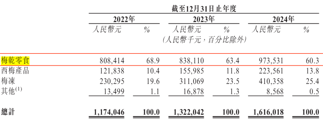 另外,在打造了梅冻这一现象级大单品之后,溜溜果园依旧十分依赖梅干零食。2022年至2024年,梅干零食每年贡献60%以上的收入。