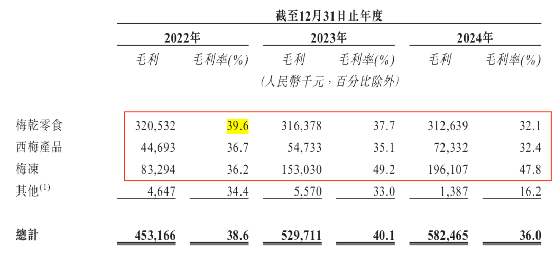 不仅如此,于报告期内,溜溜果园的梅干零食、西梅产品毛利率全部下滑,而梅冻的毛利率虽在2023年有所上升,但2024年又下滑至47.8%。