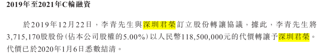 2019年12月22日,B轮投资者李青将所持371.52万股股份(占公司股权的5%)转让予深圳君荣,套现约1.19亿元。此时,距离公司在12月8日撤回A股上市申请,只过去了2周时间。