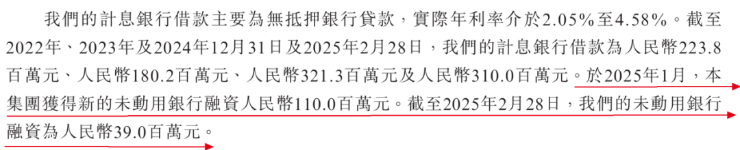 而溜溜果园支付的这笔利息,从D轮投资方处获得的融资款显然不够,而溜溜果园也疑似动用了银行贷款。招股书显示,2025年1月,公司获得新的未动用银行融资1.1亿元。截至2025年2月28日,公司未动用银行融资仅剩3900万元。