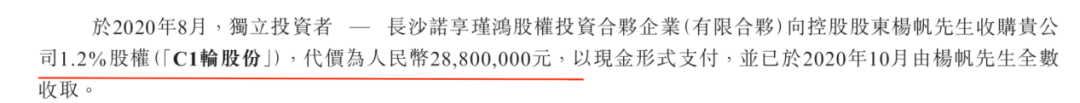 报告期内,现金流紧张的溜溜果园没有派付股息,但杨帆还是通过转让股权赚得一笔。2020年8月,杨帆向C轮投资者长沙诺享瑾鸿转让1.2%股权,套现2880万元。