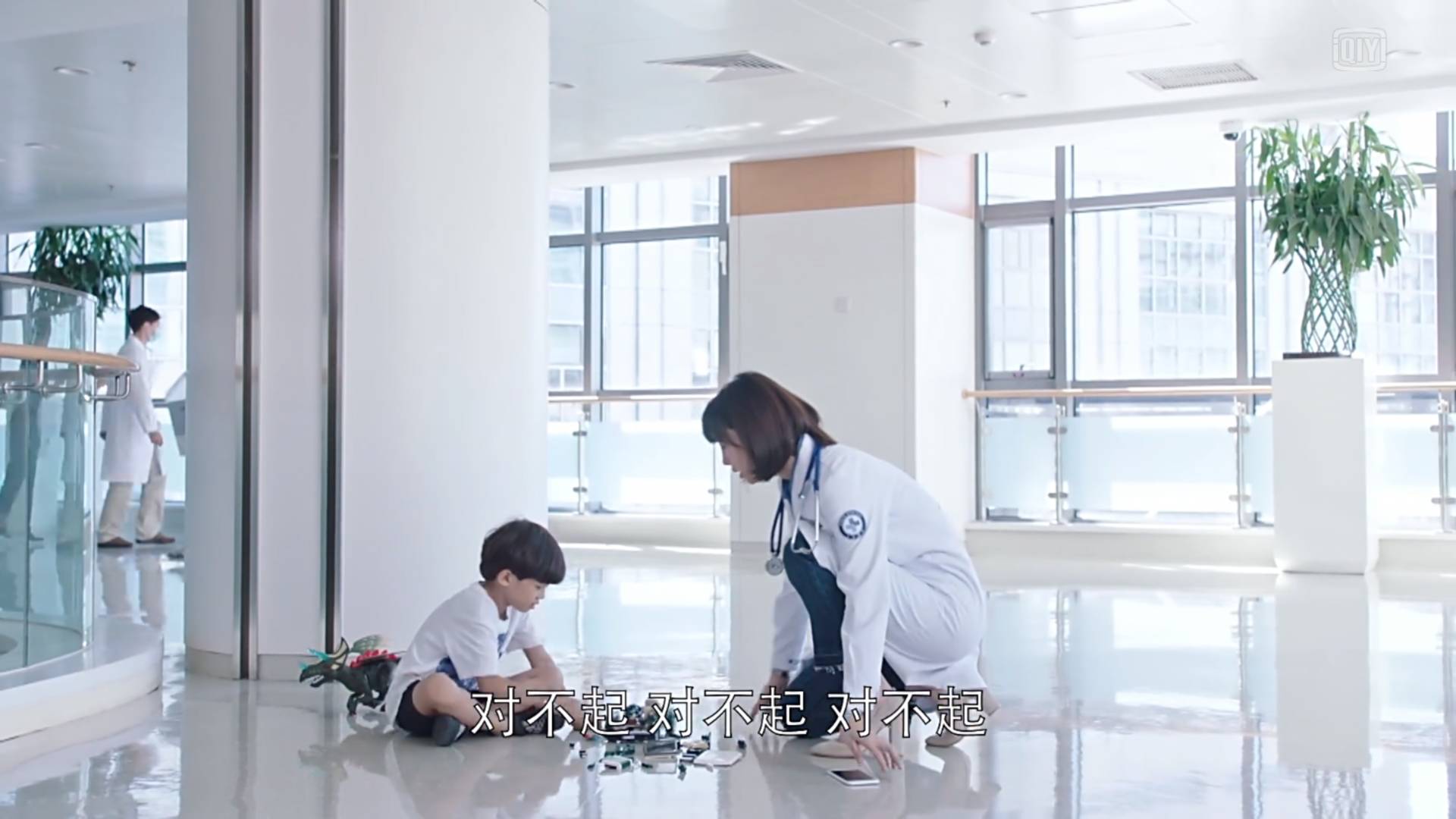 第一集先是穿着高跟鞋在医院走廊里狂奔,撞到了小男孩堆的乐高,无视急诊科的会诊的紧急,蹲在地上和小男孩玩起了玩具。
