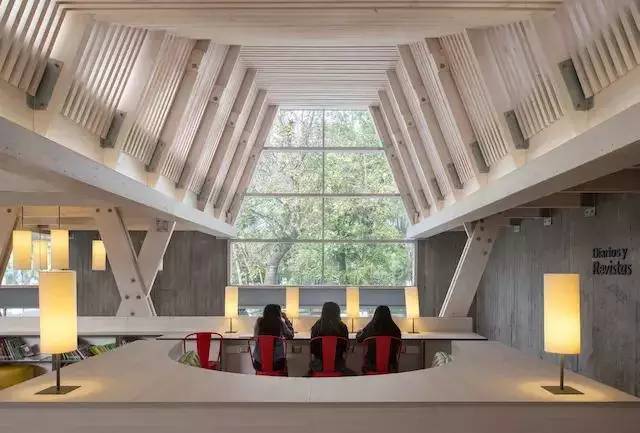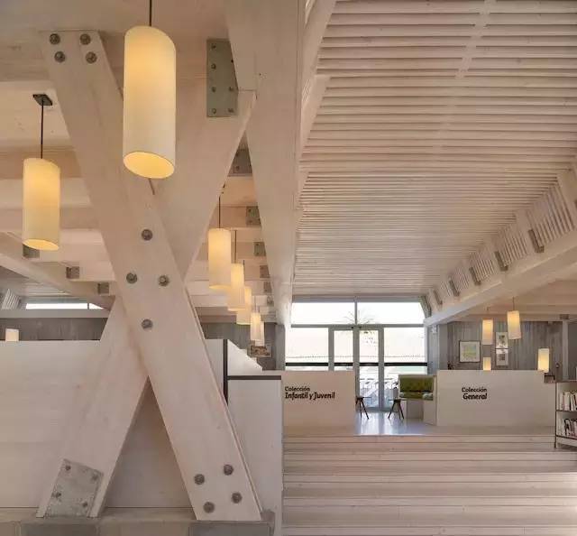 为了过滤和平衡光的强度,三个读书区的主要领域(儿童、青年和成人读者区)覆盖了3个网状的木质通廊。