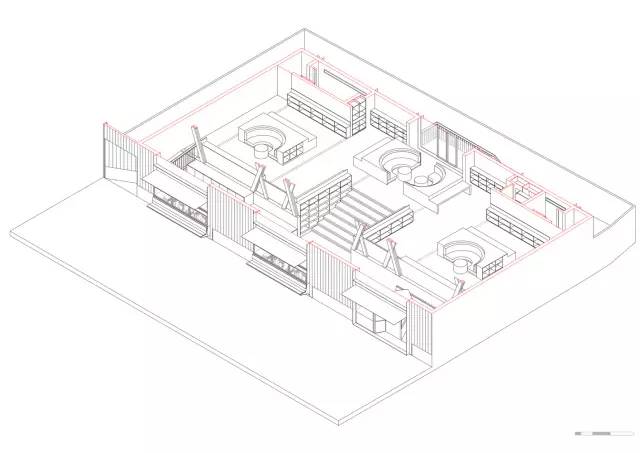 三个盒子下面分别对应了儿童、青年人和成年区,居民可以各取所需。最中心是两个环形沙发,可以用作讨论区或举办读书会。