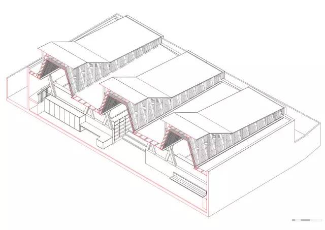 梯形的两腰部分有序地排列着木质构造,增添了整体建筑的美感。