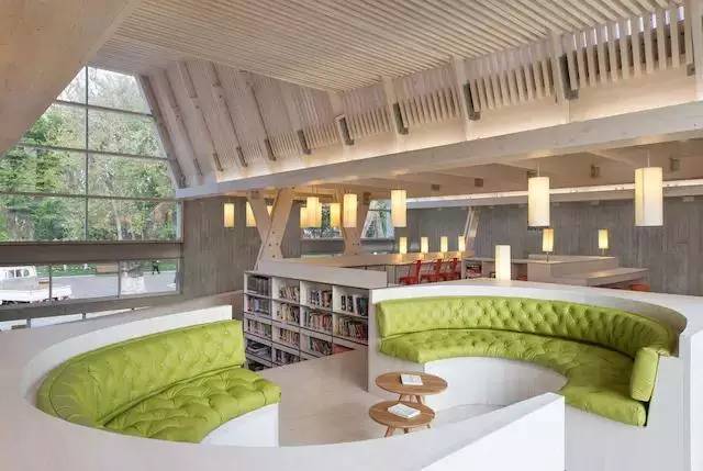 图书馆织物上所选择的其他颜色模仿了树木和树叶的绿色。从这个意义上来说,图书馆可以被看作是一个共振箱,增添了图书馆内部的生机,也能令读者产生愉悦的阅读心情。